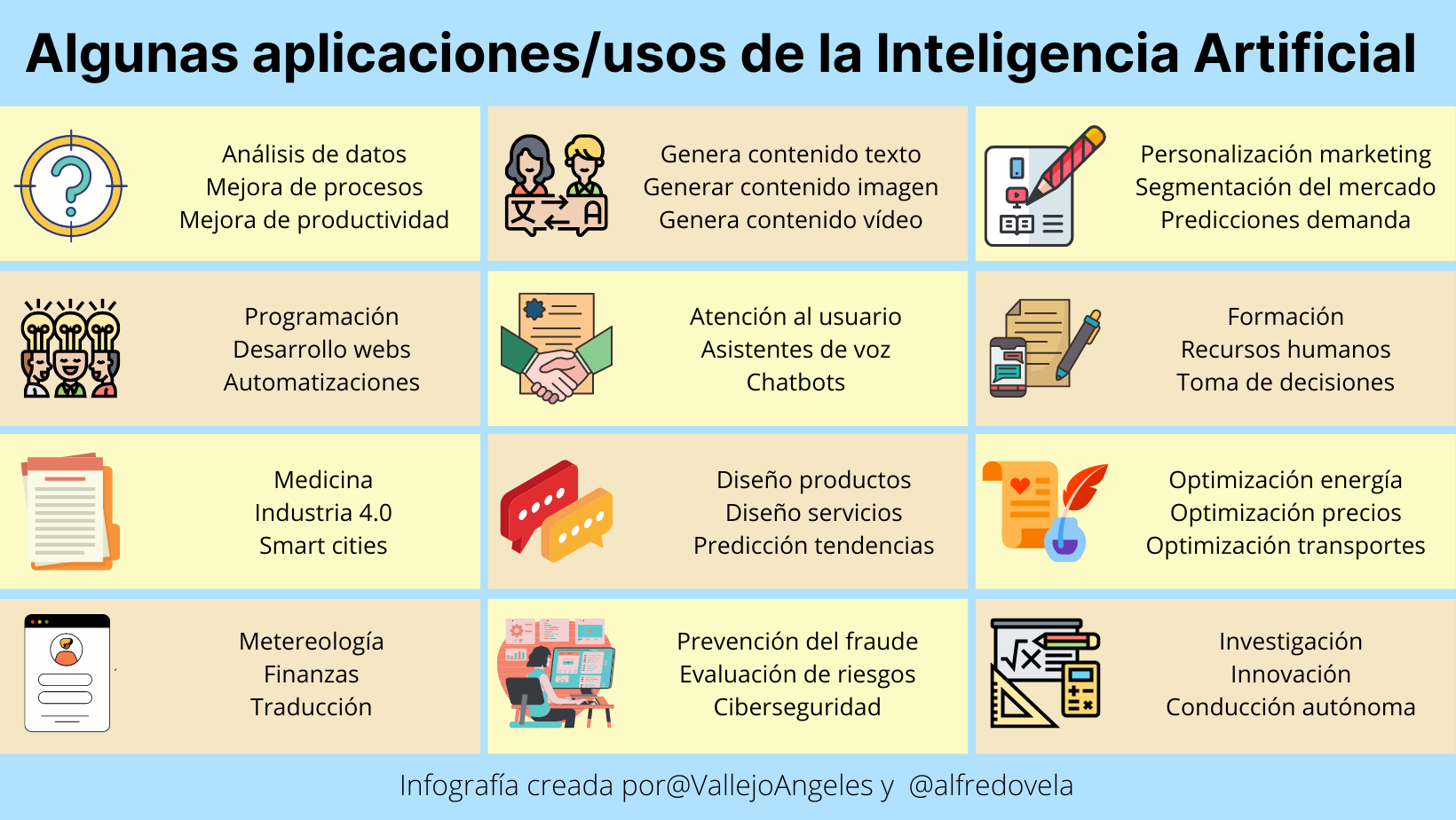 una infografía con algunos usos-aplicaciones de la inteligencia artificial.