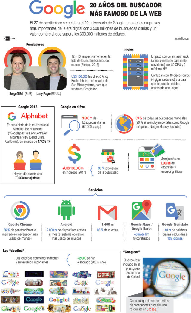 Una infografía con algunos datos de los primeros 20 años de Google. Vía