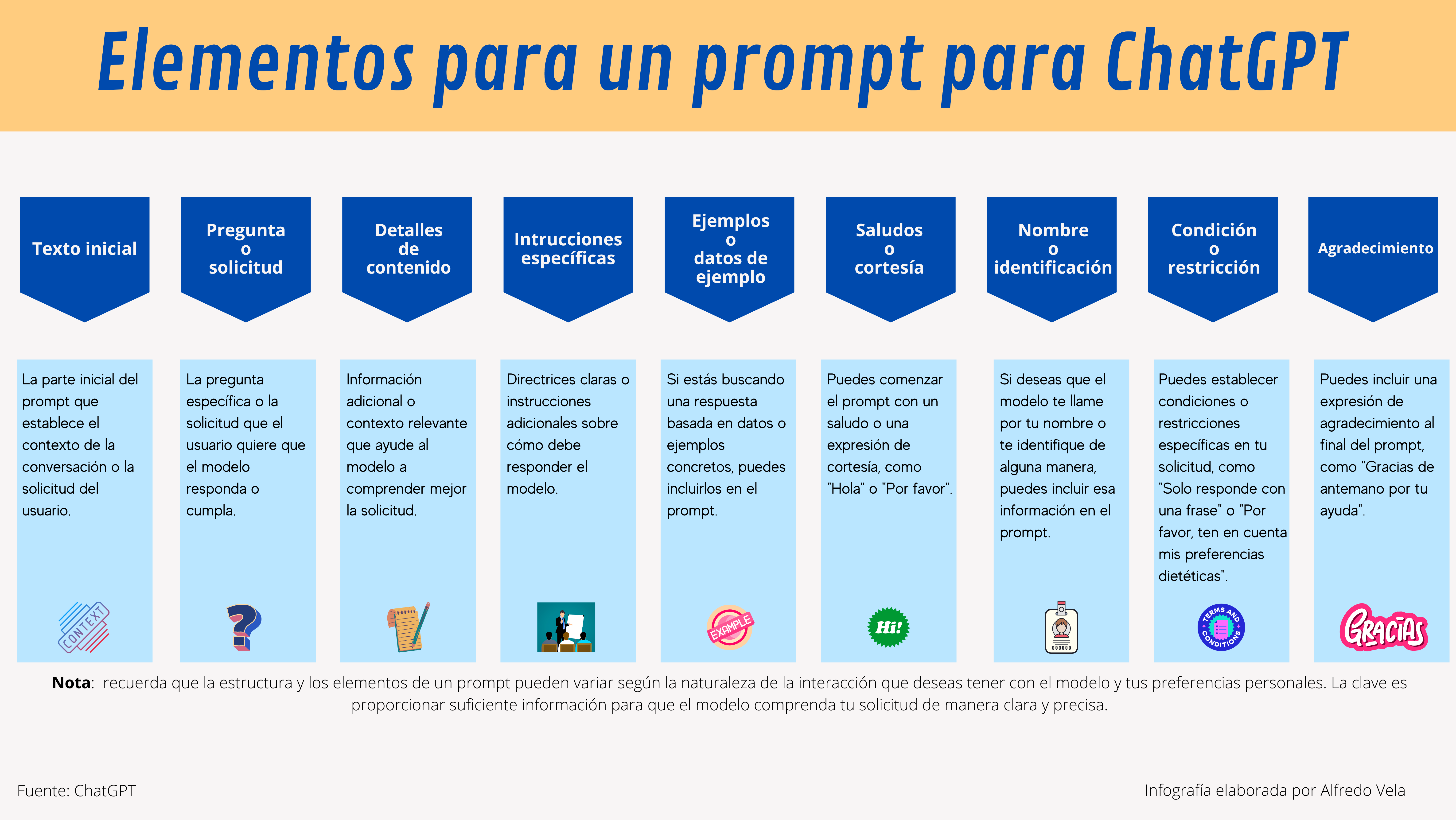 os dejo con una infografía sobre los Elementos de un prompt para ChatGPT.