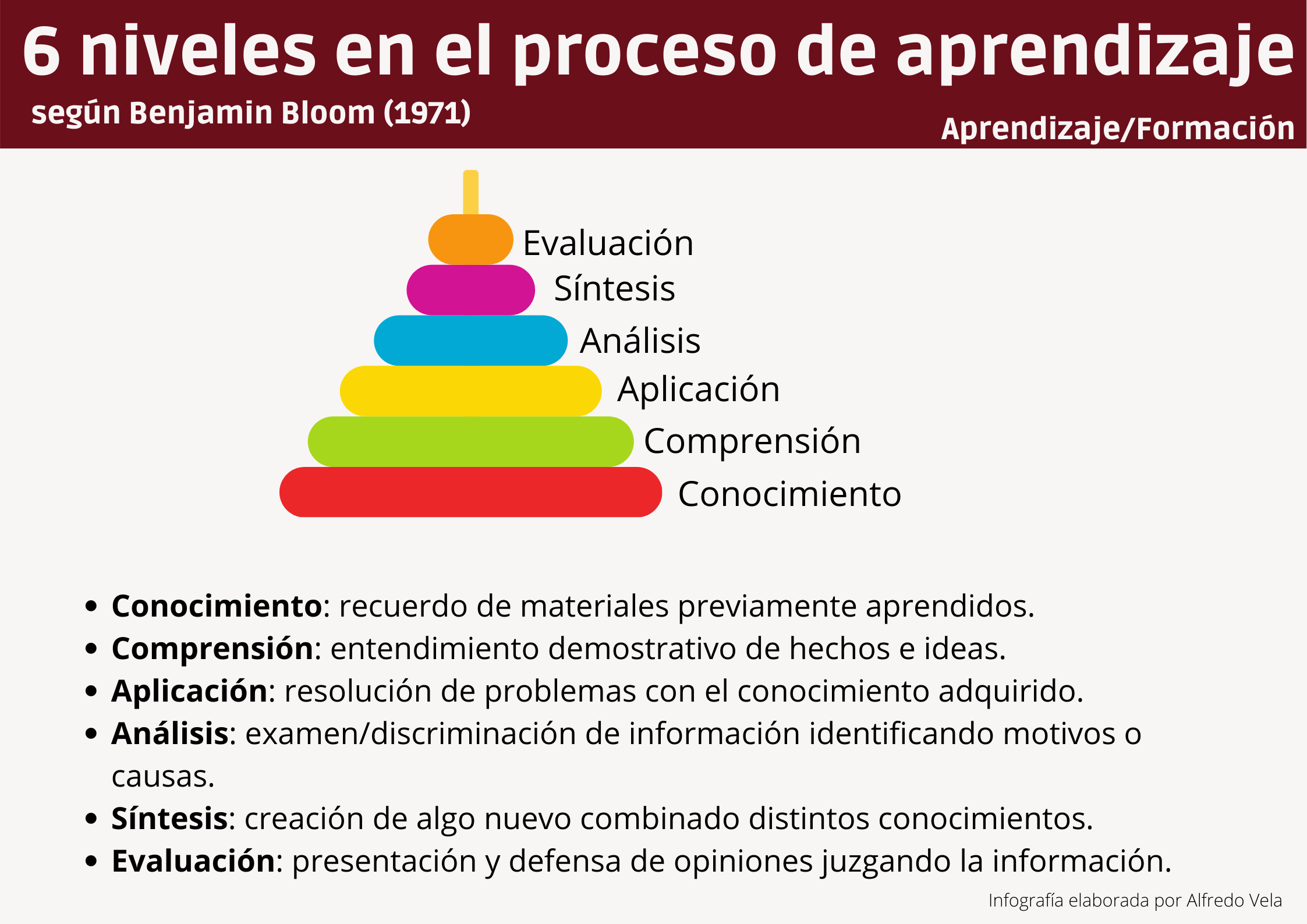 Una infografía con los 6 niveles en el Proceso de Aprendizaje según Bloom.