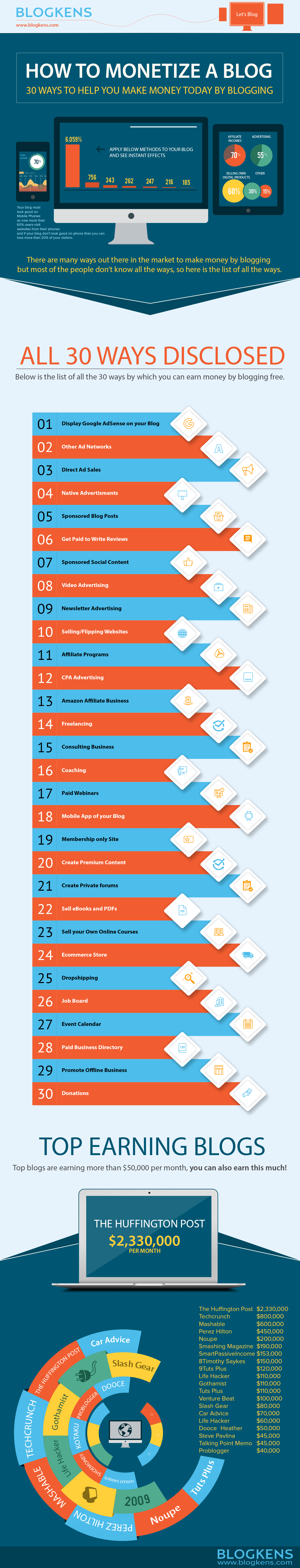 Una infografía con 30 formas de monetizar tu Blog. Vía Blogkens