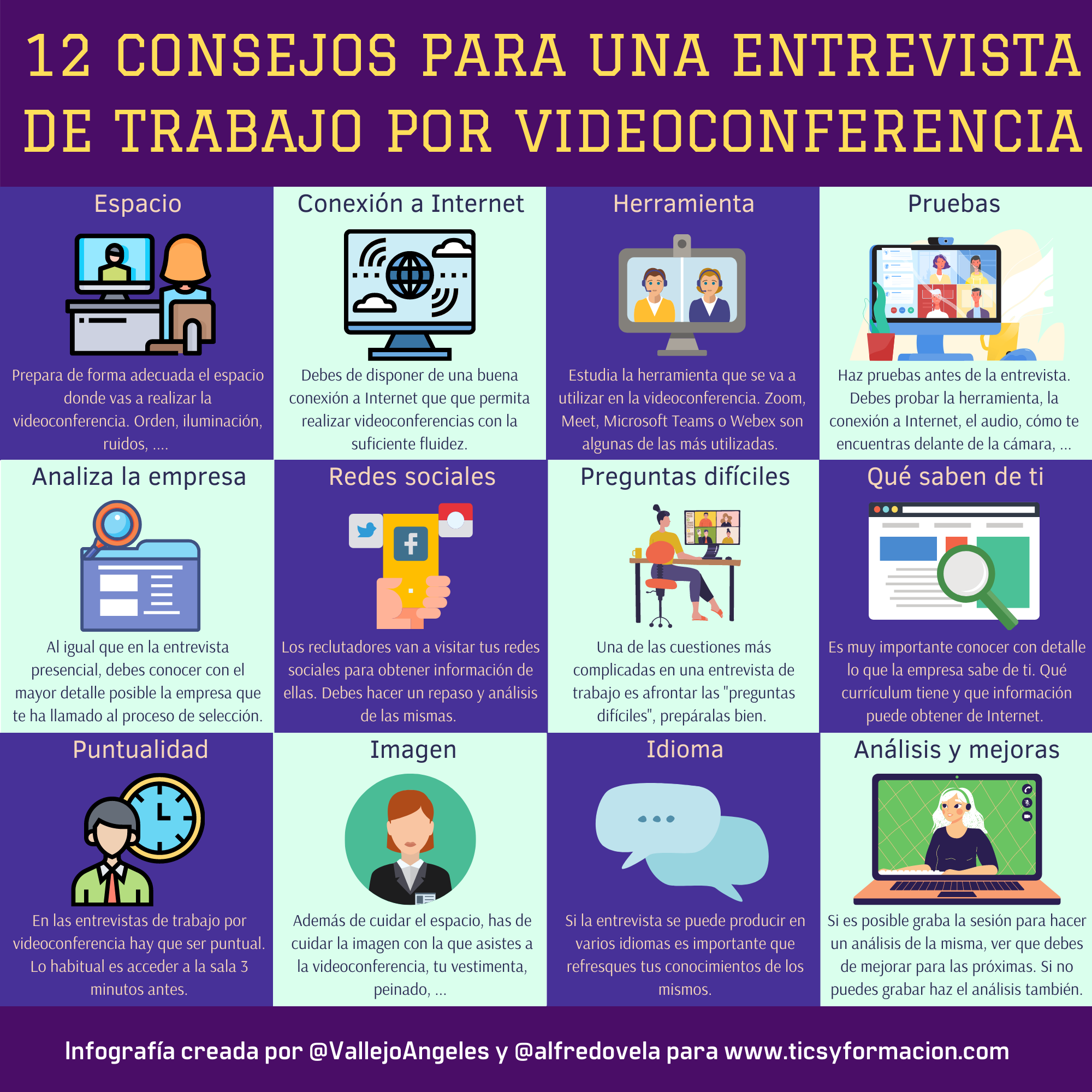 Una infografía con 12 consejos para una entrevista de trabajo por videoconferencia.
