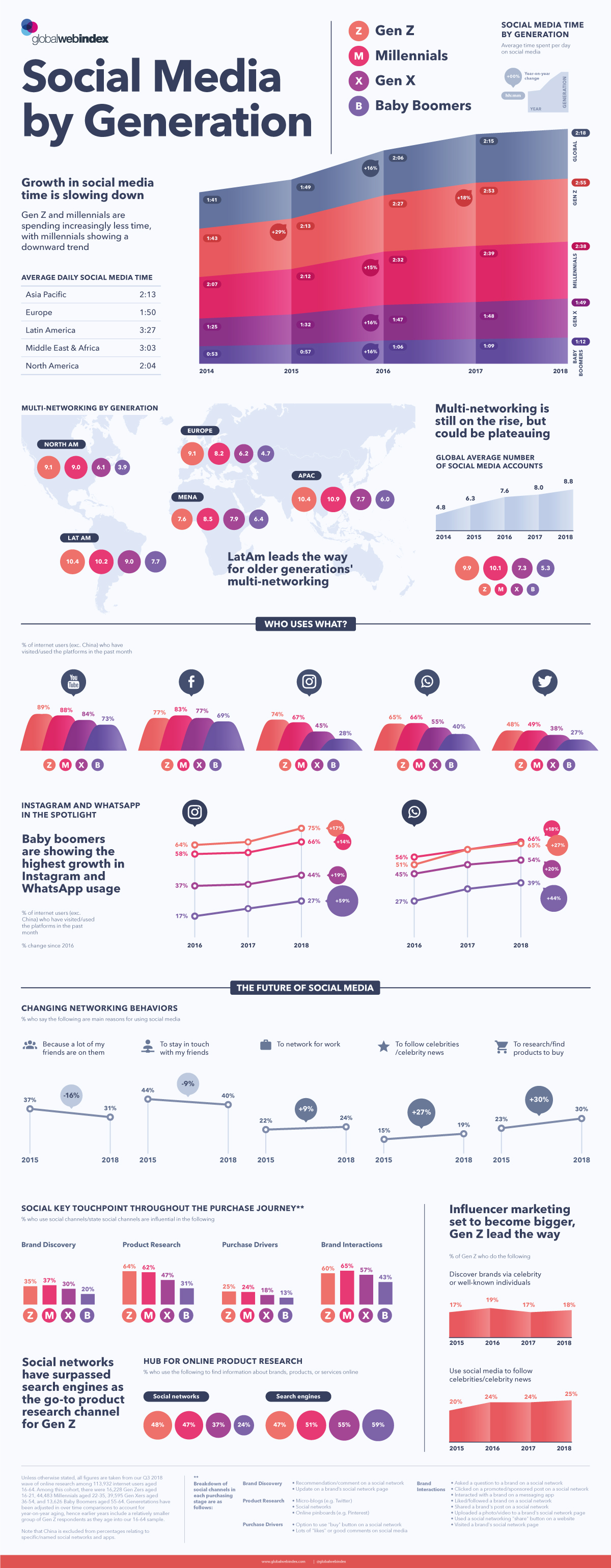 Una infografía sobre el uso de las redes sociales por generación. Vía