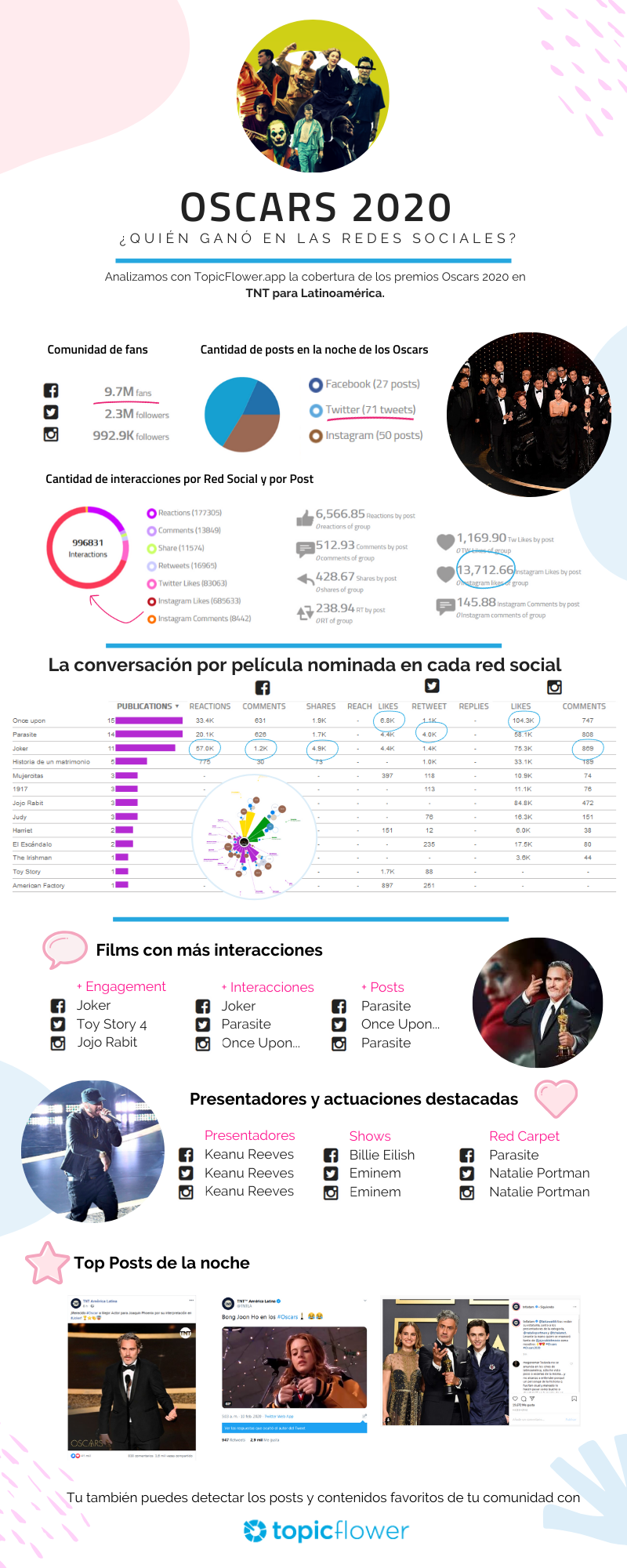 Una infografía sobre los Oscars 2020 en redes sociales. Vía TopicFlower